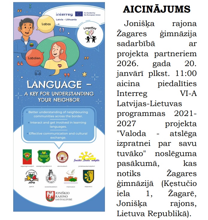 INTERREG VI-A Latvijas- Lietuvas Programmas 2021.- 2027.gadam projektu konkursa 1.prioritātes "Institucionālo spēju stiprināšana un iedzīvotāju sadarbība" projekts Nr.LL-00055 "Valoda ir atslēga, lai saprastu savus kaimiņus" (Language – a key for understanding your neighbor)