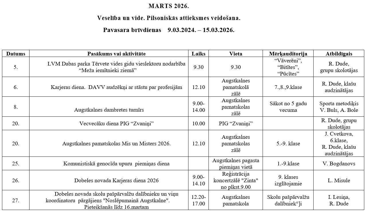 Augstkalnes pamatskola aicina topošos 2026./27.m.g. pirmklasniekus pievienoties skolas saimei.Skolā var apgūt Pamatizglītības programmu (21011111) un Speciālās pamatizglītības programmu izglītojamajiem ar mācīšanās traucējumiem (21015611).Skola īsteno arī daudzveidīgas interešu izglītības programmas - pulciņus un sporta nodarbības, nepieciešamības gadījumā nodrošinām ar skolēnu autobusiem uz un no skolas (trīs maršruti no tuvākās apkārtnes), garšīgu ēdienu un mācības notiek īstā pilī, skaistā un labiekārtotā vidē!Pieteikties var personīgi pie skolas lietvedes darba dienās no plkst. 9:00-15:00, pirms tam saskaņojot vizīti pa tālruni 63729459 vai iesniedzot iesnieguma veidlapu elektroniski, nosūtot to uz e-pastu: augstkalnes.skola@dobele.lv